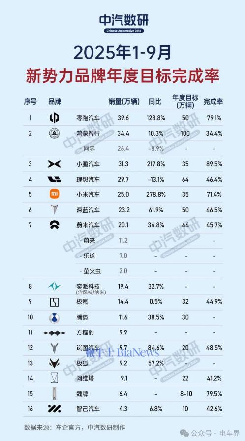 据中汽数研公布1-9月新势力品牌年度目标完成率数据显示,在前三季度的市场竞争中,部分品牌距离年度目标仍有较大差距。可见,这次“购置税补贴”也是一场激烈的竞争。